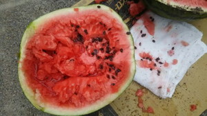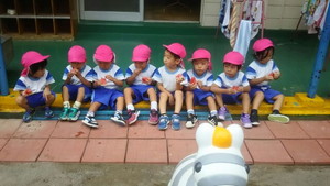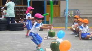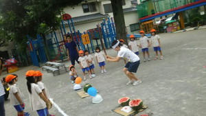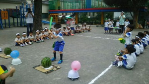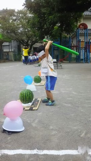 年少組さんは、初めてのスイカ割り・・・目隠しをされて不安そう。 年中組さんは、自分たちでアイマスクを作りました。 見えているのか・・・みんな真っすぐにスイカに向って歩けました。 年長組さんは、さすが応援もたたき方も個性豊かです。 スイカを割らずに風船をしとめました。 岩井先生が、スイカを一刀両断。 あま〜い!スイカをたくさん食べました。